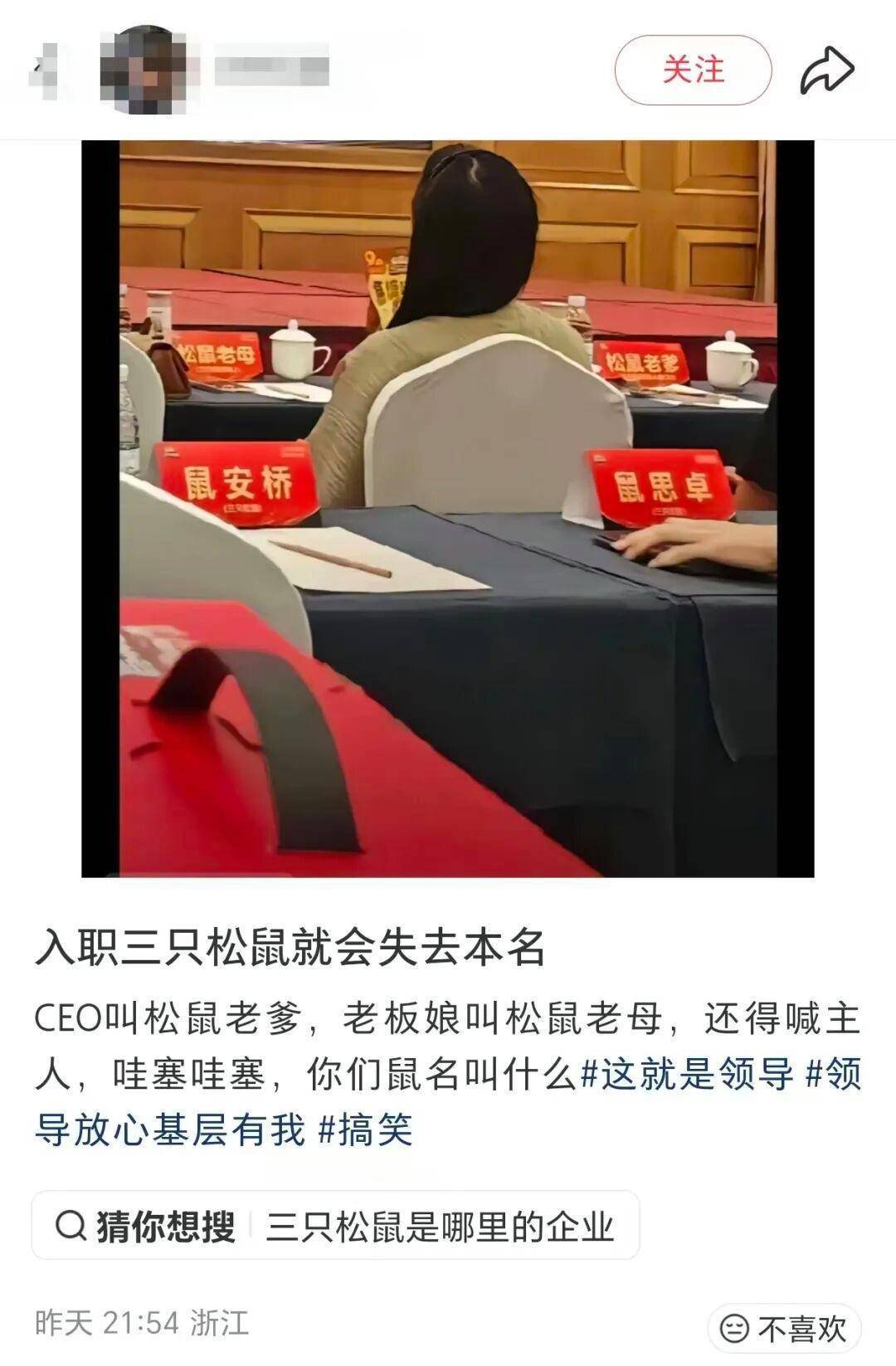 据该网友发布的照片显示,在一会议现场上,每个座位都摆放着以“鼠”字开头的名牌,如“松鼠老爹”“松鼠老母”等。据介绍,“松鼠老爹”即公司创始人章燎原。